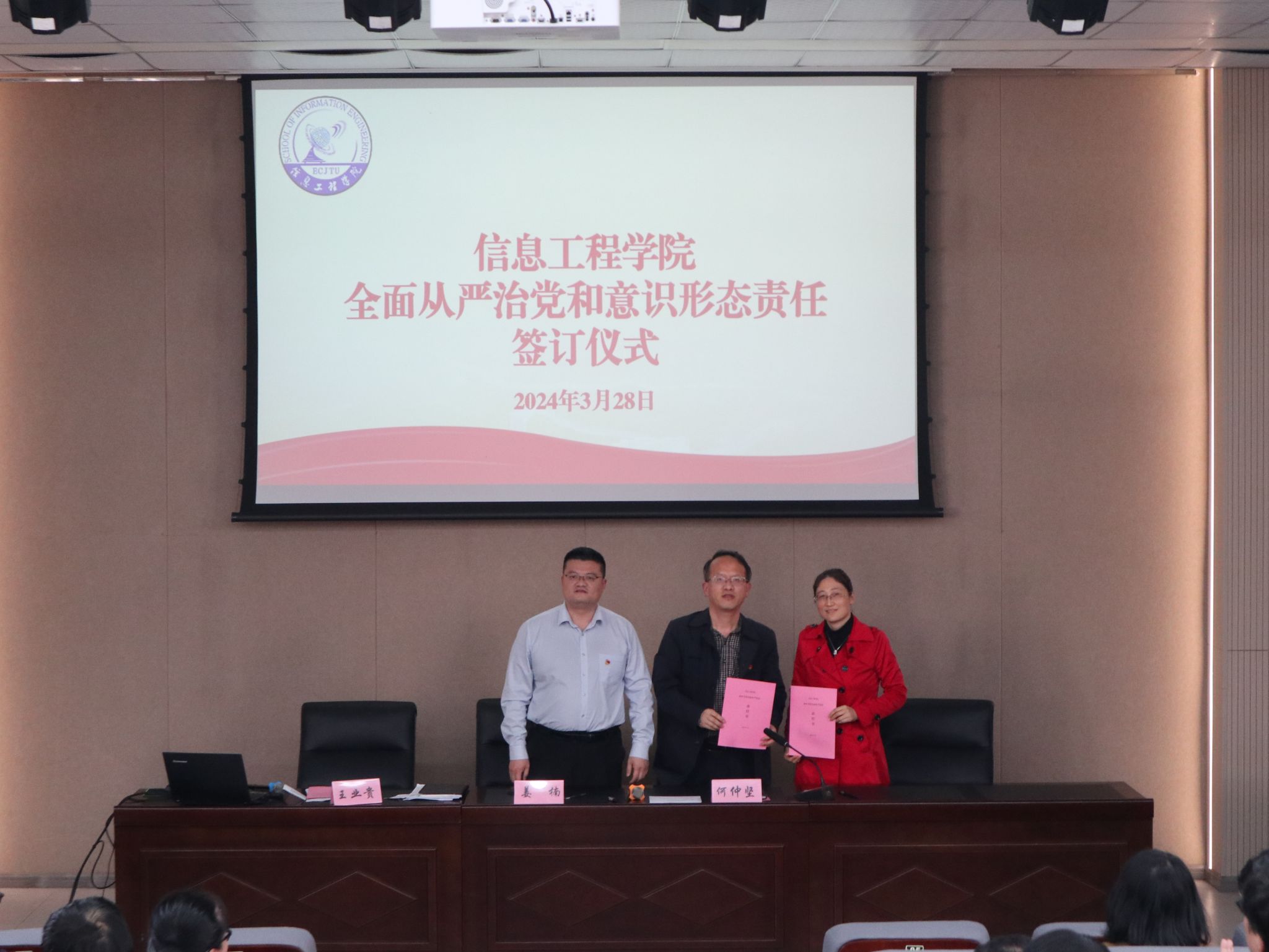为深入贯彻落实学校2024年全面从严治党工作会议精神,全面推进学院全面从严治党工作,3月28日,信息工程学院党委召开2024年全面从严治党工作会议,全体教工和学生党员代表参加会议。