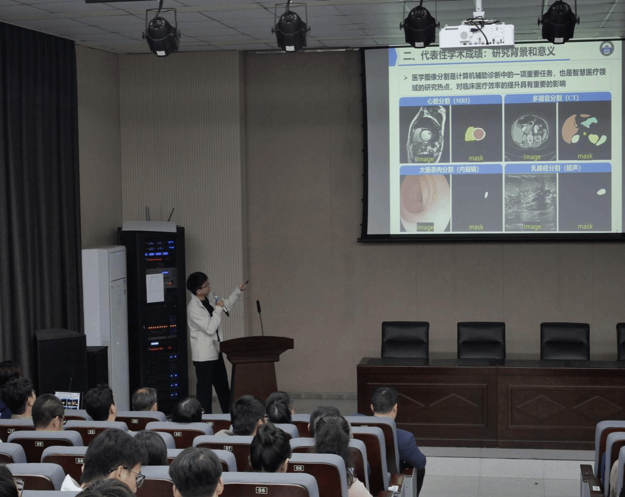 分论坛特别邀请北京科技大学黄超副教授、香港理工大学、澳门大学、武汉大学、浙江大学等10余名优秀青年学者。在主会场报告环节,多位杰出学者进行了精彩纷呈的汇报。武汉大学在读博士董文会深入探讨了医学图像分割的挑战,包括深度学习模型中先验融合问题;香港理工大学张浩湉介绍了依托深度学习模型制作的EMC康复机器人,助力脑卒中病人康复训练。北京交通大学王斌则详细解读了Web3.0的前沿技术。其他学者也纷纷登台汇报,就各自的研究领域和项目展开了精彩的论述。他们用生动的语言、详实的数据和清晰的逻辑,将自己的科研成果和心得逐一呈现,赢得了在场师生的阵阵掌声。