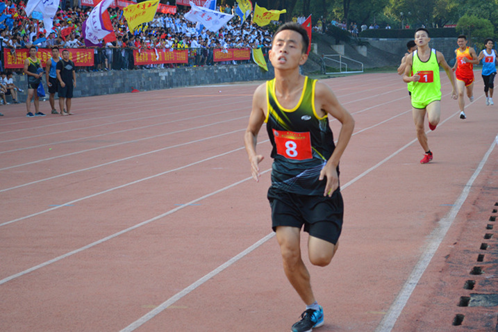 随着裁判的一声哨响,比赛开始了。1500米不是个小数目,前期,王斌为保存体力,并没有全力冲刺,一直保持稳速前进。过第一个弯道时,王斌发力冲到第二,后又恢复到之前的速度。后期,原来一直处于首位的选手体力下降,渐渐落后。王斌在取得优势后,逐步地扩大优势,与其它学院的选手间的距离越拉越大。在最后100米,他全力冲刺,整个观众席都沸腾了,大声的喊叫着为他助威,最终王斌以4分47秒的优异成绩在率先冲过终点。