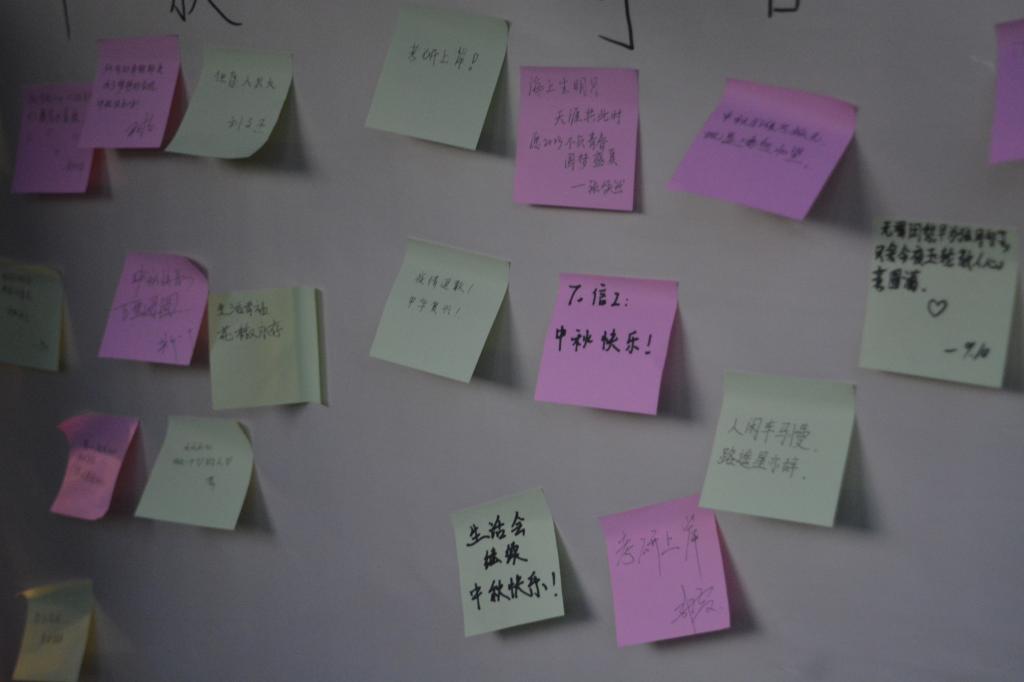 天色渐晚,圆月初升,此次活动正式开始。同学们在活动现场制作小橘灯以及团扇等精美的物品,既能够互相分享喜悦和乐趣,又能够体验到其中的文化之美。猜灯谜活动更是引来不少同学参与,谜面有猜字的,猜成语的,还有猜人名和地名的,充满趣味性与知识性。一旁的中秋留言板处,同学们亲笔写下对自己的寄语,对生活的期许,对学校的祝福以及对祖国的热爱。活动现场处处洋溢着中秋佳节的温馨气氛。