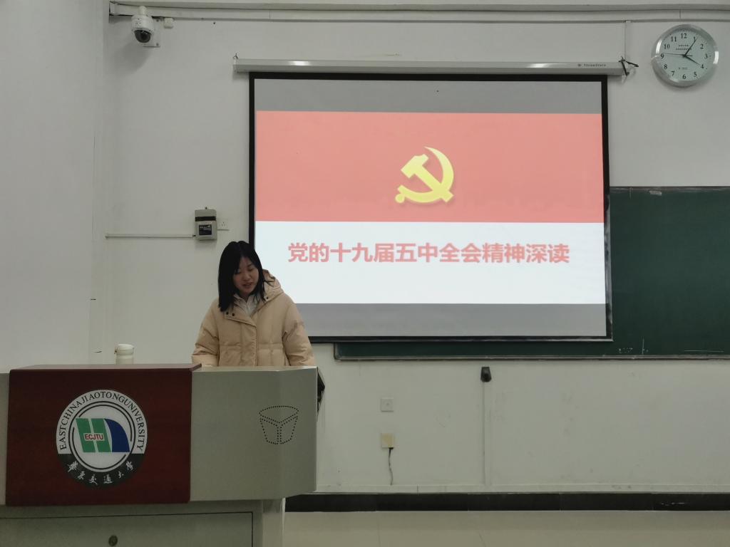 1班团支书团支书叶琼从规划《建议》起草、规划《建议》亮点、规划《建议》突出民生议题、双循环的新发展格局和如何实现2035年远景目标,这五个方面对十九届五中全会精神进行了深入阐述。并强调:党的十九届五中全会站在“两个一百年”奋斗目标的历史交汇点,擘画发展蓝图、规划实践路径、作出战略部署,为夺取全面建设社会主义现代化国家新胜利注入强大思想和行动力量。