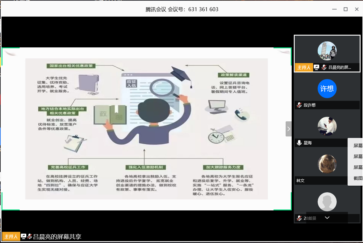 为加强同学们对征兵工作的了解,增强同学们应征入伍的积极性,5月14日,17通信一班、二班利用腾讯会议线上举办2020年江西省高校征兵工作宣讲会。本次会议由信息工程学院党委副书记兼通信一、二班辅导员何仲坚组织召开。
