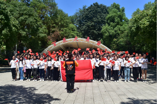 “浪是那海的赤子,海是那浪的寄托……”参赛者们汇聚一起,闪现八一公园,一曲《我和我的祖国》歌声嘹亮,三校参赛人员手举红旗齐声合唱,目光坚定,用歌声表达爱国之情。路人纷纷驻足,拿出手机拍照留念。