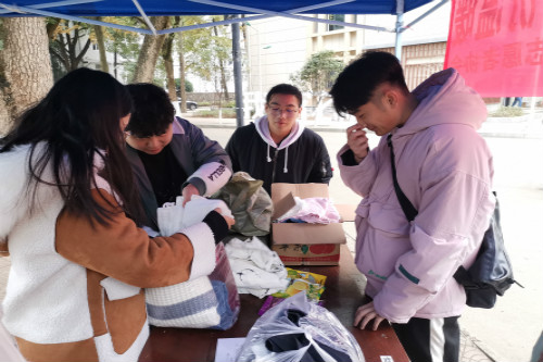 为给山区孩子带去温暖,11月30日及12月1日,信息学院于南区一食堂门口举进行志愿摆摊回收旧衣物活动。