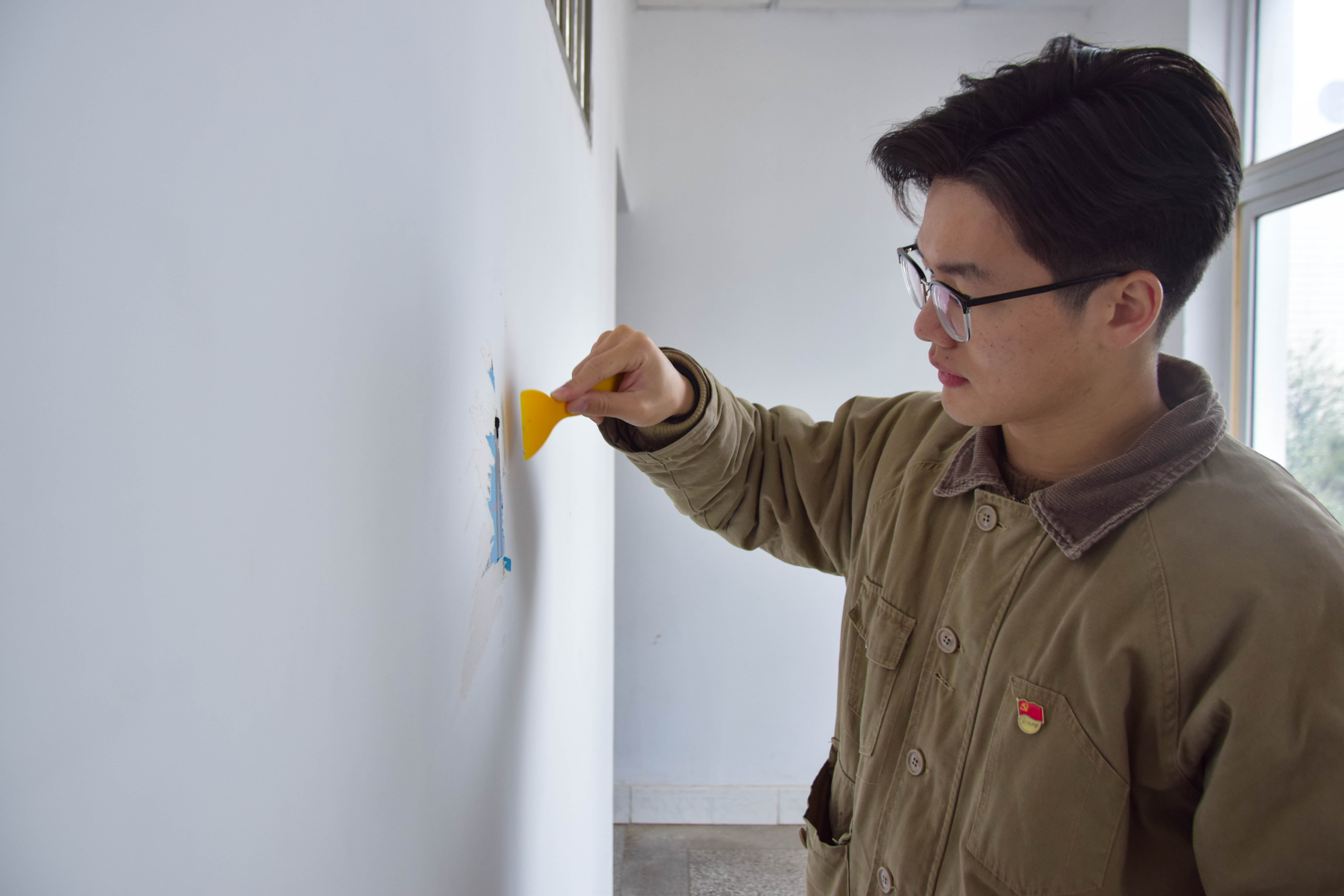 刷墙、擦宣传牌、张贴装饰品、清除门上小广告…老师与同学们都积极投身于志愿活动中。“你恐高,我来刷漆吧!”面对各种各样的挑战,学生党员们互帮互助,只为建设更美丽的党员工作站。面对种类繁多的壁贴装饰品,学生党员与老师一起认真核对每一个零部件,确保展现最完美的一面。