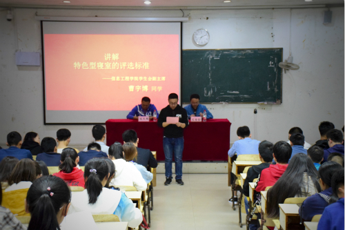 会议伊始,艾国金宣读《关于表彰2017-2018学年第二学期信息工程学院优秀寝室的决定》。曹宇博则对关于特色寝室的类别与评选标准进行讲解,特色寝室共有文体型、实践型、安全型、学习型、卫生型五种类别,学院会根据各个寝室的学习氛围、卫生安全、活动积极性等多个方面进行评选。
