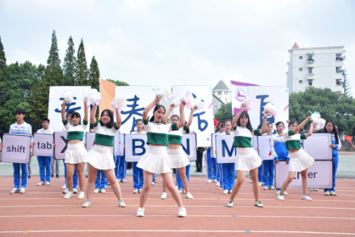 伴随着激情昂扬《运动员进行曲》,各学院的检阅队依次从主席台前走过并表演独具学院特色的节目,给台上领导和台下观众呈现出一场视听盛宴。嘹亮的口号声传来,信息学院检阅队的每一名成员都精神饱满,他们踏着整齐的步伐,意气风发地向前迈进,尽显信息风采。检阅队成员用举牌来模拟键盘,最终“敲”出“青春信息”四个大字,彰显信息特色;啦啦队成员跳起轻快活泼的啦啦舞,舞姿轻盈优美,引来全场观众的阵阵掌声。“劈波斩浪,扬帆起航;青春信息,奋力激昂”,位于观众席的信息学子们热情高涨,为信息健儿呐喊助威。