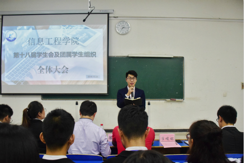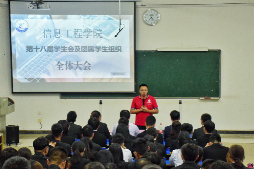 10月25日,信息学院于逸夫楼105室举办第十八届学生会及团属学生组织第一次全体大会。信息学院学工办主任兼团委书记陈文锦、辅导员艾国金出席会议。信息学院第十八届学生会及团属学生组织全体成员与会。