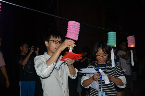 中秋诗歌大会分为 “诗词飞花令”、 “歌曲飞花令”两部分。挑战者只要说出含有主题字的诗词,或唱出歌名中含有月的歌曲即可获得奖品。月色朦胧中,或激昂或悠扬的吟诵声、或柔美或稚嫩的歌声引得不少路人驻足翘首。一位阿姨在“歌曲飞花令”中演唱的《花好月圆夜》更是瞬间收获了一群小粉丝。满当当的心语墙上是大家对未来的美好愿景。其中不仅包含着共迎佳节的喜悦,还有着对党对十九大的殷切祝愿。祭月仪式上身着汉服的男、女二位主祭庄严肃穆。鞠躬、上香、祭酒、拜月。随着执事的一声礼成,趣味灯谜会也至此落幕。