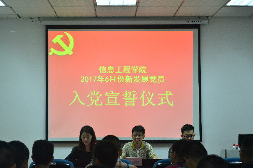 6月27日,2017信息学院新党员入党宣誓仪式于教四栋307室顺利召开。信息学院党委组织员黄清华、信息学院党员管理中心常务副主任于鹏出席会议,预备党员与会。