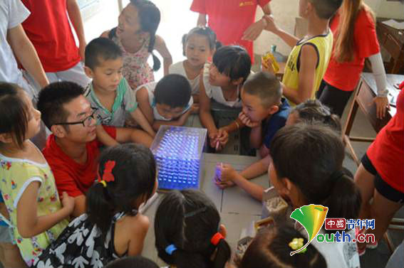 在课堂上,志愿者们为这群“科技爱好者”们对光立方、流水灯等进行了简单的介绍,并手把手教授孩子们使用电脑,学会基本打字方法,并利用下载好的学习英语小游戏,让孩子们进行“线上”学习,充分发挥“互联网+教育”的优势,让孩子们在游戏中感受乐趣的同时,学到相关知识。