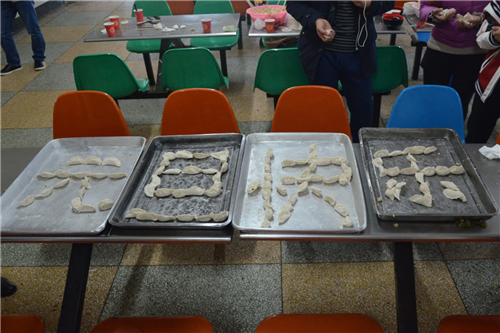 只见桌子上满是饺子皮、饺子馅,颇有新年味道。将饺子皮平铺在手掌上,放上一勺饺子馅,两边合起一点点地捏合住,一个“元宝”饺子就完成了,大家争先恐后地包着饺子,不会包的也学着包,场面十分热闹。现场,两名包饺子“能手”蓄势待发,裁判一声令下,包饺子速度比赛开始了,两方不相上下,追求速度的同时保证每一个饺子都很标志,最终通信二班甘小立同学以一分钟13个饺子的成绩获得比赛的胜利。现场更是评选出“最标致饺子”、“最有勇气饺子”,同学们用饺子拼图,庆祝元旦。
