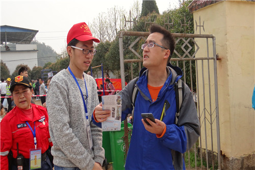 开幕式结束后,志愿者们的工作仍在进行,大约一百多个志愿者分为十组,分别为摄影组,后勤组,打卡组等部分志愿者跟随者参赛者在路途中以防突发状况的发生指路组负责举牌为参赛者引路。指路志愿者为了参赛人员看得清楚,双手高举牌子一个小时过去了,汗水湿透了衣衫,嘴唇干成白色,他们仍咬牙坚持着。山路十分难走,遇到参赛者出现不想走的状况,志愿者鼓舞:“再坚持五分钟我们就能到达打卡点了。”给参赛者带去了希望和坚持下去的动力。参赛者到达终点后,由于山路狭窄导致堵车,很多参赛者仍在终点位置停滞。志愿者在终点为参赛人员统计时间,颁发证书,分发食物。他们带往休息处,维持现场秩序。