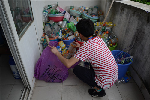 志愿者们收集各寝室的废旧汽水瓶、易拉罐,装在麻袋里分类装好,“这些瓶子我们会运到废品收购站卖掉,卖出的零钱将转入青协“阳光添瓶”公益基金”志愿者提着一袋废弃瓶子说道。