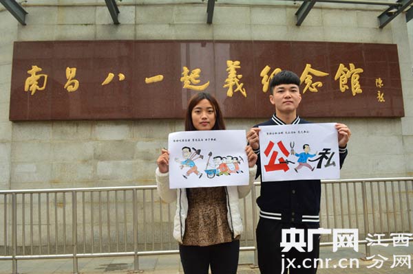 “廉洁从政,自觉保持人民公仆本色”、“坚持公私分明,先公后私,克己奉公”……对着古八一起义纪念塔,向着今“八一”廉洁准则,党课学员庄重敬礼;背后是江泽民提笔“军旗升起的地方”,前是今颁布的“八一”廉洁自律准则,党课学员竖起大拇指为其点赞;侧面是横跨赣江的八一大桥,手掌握住的是面向中国共产党实施的廉洁自律准则,华东交大党课学员端庄严肃,无畏细雨寒风临立江头。