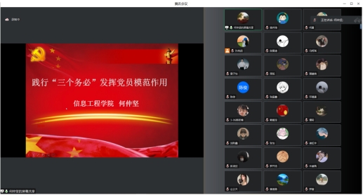 4月27日,信息工程学院创新基地党支部举行主题党日活动,院党委书记何仲坚以《践行“三个务必” 发挥党员模范作用》为题上了一堂专题党课。