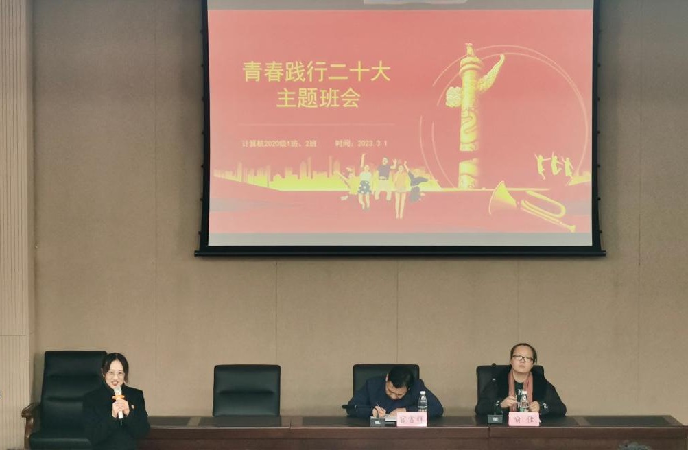 为深入学习宣传贯彻落实党的二十大精神,激发学生青春奋斗力量,3月1日,2020级计算机一班、二班召开“青春践行二十大”主题班会。班会邀请学院副院长官雪辉、计算机系主任兼学业导师喻佳参加,并就升学、就业等问题进行指导。辅导员李萌萌主持班会。